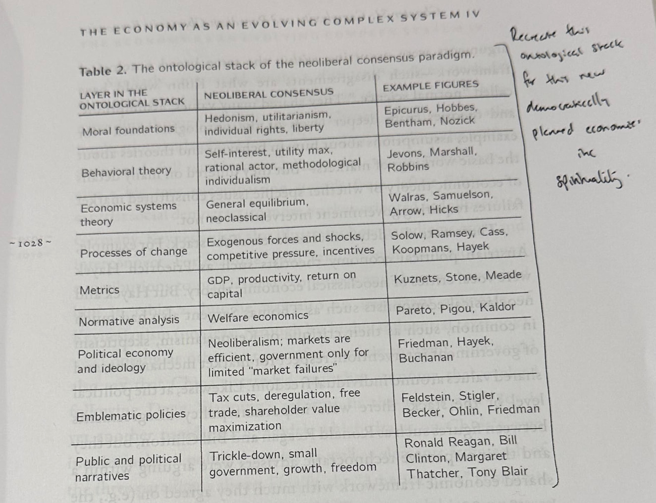 I’m writing a research paper on alternative economic futures, there’s a primary data element where I intend to engage with religious and spiritual groups to inform some of the quantitative and wider literature aspects. I’d love to know your thoughts on what the “ontological stack” for democratic planning would be i.e what the “set of mutually reinforcing, interlocking concepts that form the basis of an economic paradigm”. For example the ontological stack for neoliberal economies can be defined as: